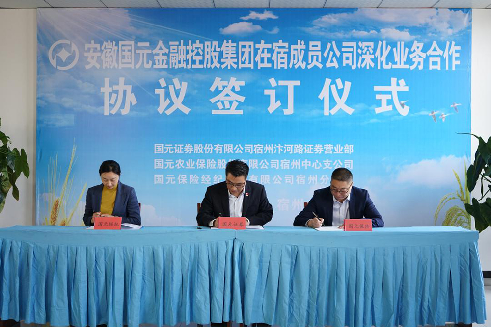 4月28日上午,安徽國(guó)元金控集團(tuán)在宿成員公司國(guó)元保險(xiǎn)宿州中支、國(guó)元證券宿州汴河路營(yíng)業(yè)部、國(guó)元保險(xiǎn)經(jīng)紀(jì)宿州分公司深化業(yè)務(wù)合作協(xié)議簽訂儀式正式舉行。國(guó)元保險(xiǎn)宿州中支負(fù)責(zé)人楊士柱、國(guó)元證券宿州汴河路營(yíng)業(yè)部負(fù)責(zé)人呂飛、國(guó)元保險(xiǎn)經(jīng)紀(jì)宿州分公司負(fù)責(zé)人李鳳至作為三家公司簽約代表,共同簽署合作協(xié)議。